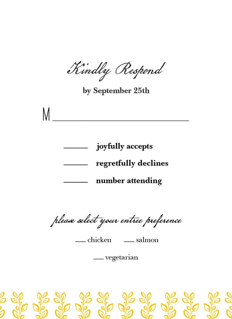 Complete your wedding card set with an artist-designed Wedding RSVP Card printed with premium quality.