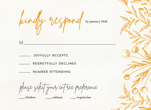 Complete your wedding card set with an artist-designed Wedding RSVP Card printed with premium quality.