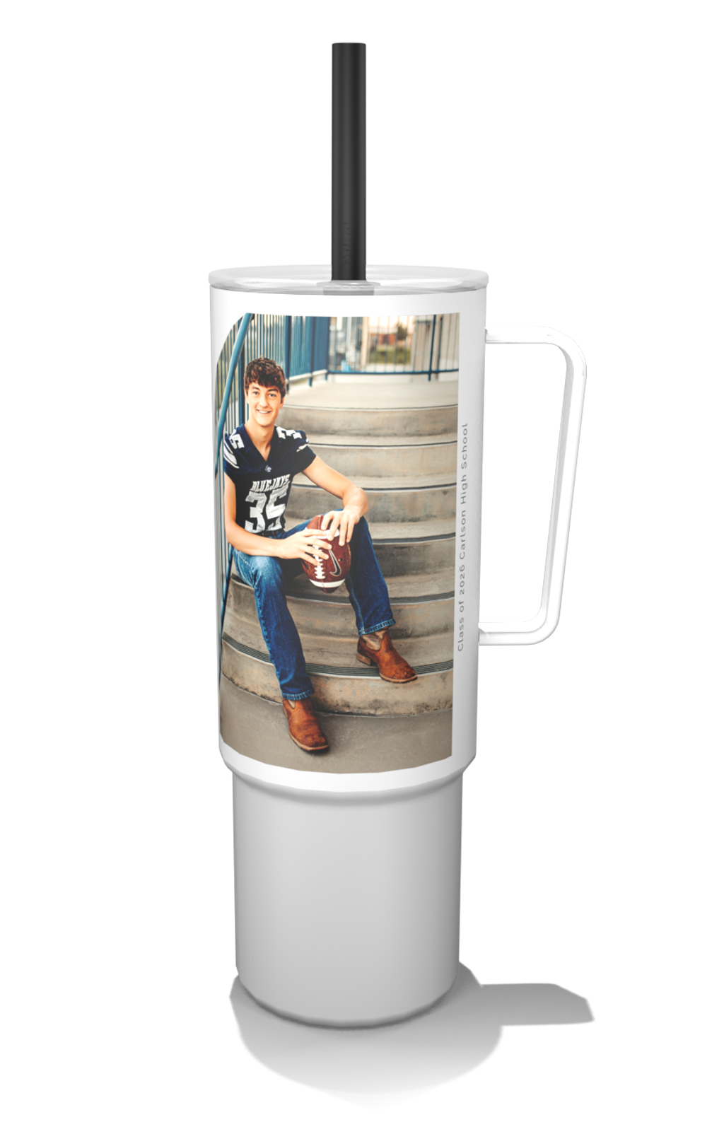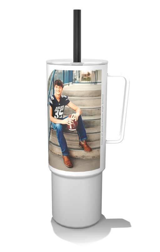 Create a customized 32oz MiiR photo tumbler with a built-in handle and flexible silicone straw for easy, on-the-go hydration.